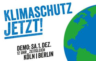 Eine breites gesellschaftliches Bündnis will die Bundesregierung an ihre Verantwortung erinnern und wird am 1. Dezember gemeinsam mit vielen Tausend Menschen gleichzeitig in Köln, vor den Toren des größten Braunkohlereviers Europas, und in Berlin, vor den Toren des Kanzleramtes, für einen schnellen Kohle-Ausstieg und einen konsequenten Klimaschutz demonstrieren.
