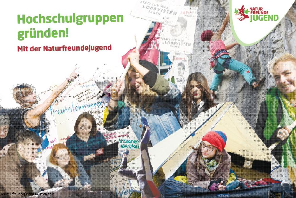 Eine der ersten Naturfreundejugend-Hochschulgruppen in Deutschland wurde von der Naturfreundejugend Thüringen gebildet. Das angebotene Themenspektrum ist so breit aufgestellt, wie es auch die NaturFreunde sind und reicht von Ferienfreizeiten und politischem Engagement über Mitbestimmung bis zu praktischem Klimaschutz. Studierende können sich in den Hochschulgruppen ausprobieren, ohne sich gleich wie etwa beim Hochschulsport oder den bereits existierenden Hochschulgruppen inhaltlich festlegen zu müssen. Und sie lernen schnell andere Studierende kennen.