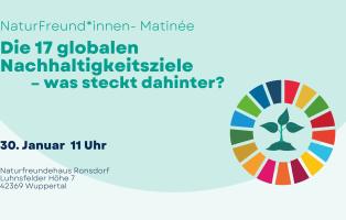 Doch was steckt hinter diesen 17 Nachhaltigkeitszielen? Was haben sie mit uns und unserem Engagement zu tun? Und wie können wir uns für die Umsetzung der Ziele in Wuppertal einsetzen? Zum Austausch über diese und weitere spannende Fragen rund um die Nachhaltigkeitsziele und deren Verwirklichung in der Stadt Wuppertal laden die NaturFreunde Wuppertal am 30. Januar um 11 Uhr ein.