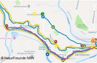 Gewandert wird ab Bushaltestelle Burg Seilbahn. (Alternativ geht dort um 11.30h los). Die Strecke führt in Unterburg entlang der Wupper und dann zu Fuß zum Waldhaus Pfaffenberg. Entlang der Strecke gibt es ein Rätselspiel zu lösen.