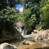 „Am besten wir gehen gleich zum Flusskraftwerk, das sind nur fünf Minuten“, begrüßt uns Panchito, ein etwa 60-jähriger Mann. Er und weitere Mitglieder der Kraftwerkskooperative haben uns bereits erwartet. In der Mittagshitze geht es bergauf und bergab. Wir durchqueren den Fluss, dessen Wasser angenehm kühl ist. Auf der anderen Seite angekommen, gehen wir am Flussufer entlang. Aus den angekündigten fünf Minuten sind inzwischen 30 Minuten geworden. Doch dann hören wir schon ein lautes Rauschen. Ein letzter steiler Abstieg und wir stehen an einem Fluss mit türkisblauem Wasser und einem malerischen Wasserfall. Unterhalb des Wasserfalls befindet sich die Wasserentnahmestelle für das kleine Kraftwerk. Ein Rohr ist in den Fluss einbetoniert und leitet einen geringen Teil des Flusswassers durch eine Leitung bis ins Dorf, wo die Turbine und der Generator stehen. „Es ist nur wenig Wasser, was wir entnehmen“, erläutert Panchito. „Dadurch bleibt für unsere Trinkwasserversorgung und die der weiter unten gelegenen Dörfer genügend Wasser und es wird nicht verschmutzt.“
